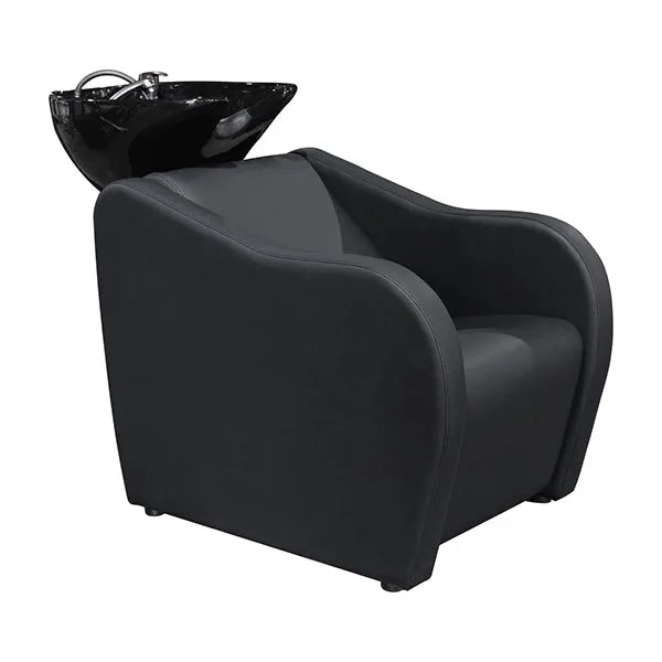 Friseur Waschbecken mit komfortablem Waschsessel in elegantem Schwarz – Friseurwaschbecken Velaris. Dieses stilvolle Waschbecken vereint modernes Design mit hoher Ergonomie und ist die perfekte Ergänzung für jeden Salon.