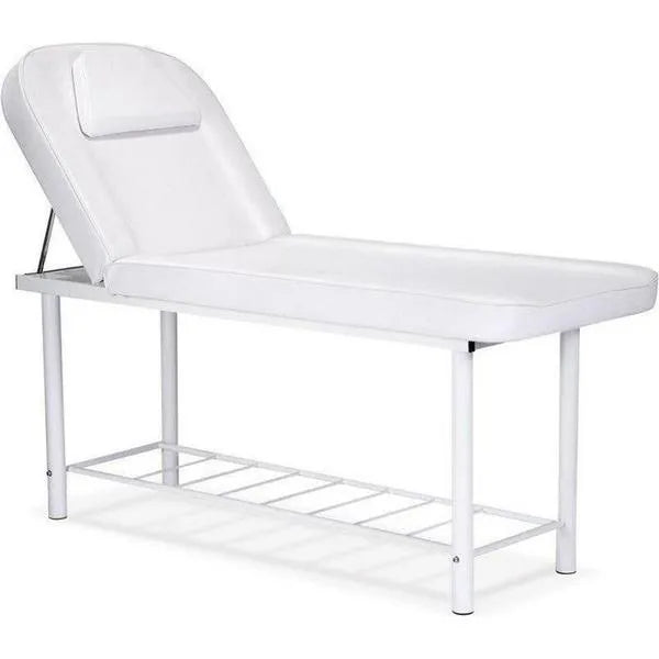 Zweiteilige Kosmetikliege mit robuster, stabiler Struktur und fester Höhe. Die Neigung der Rückenlehne lässt sich manuell verstellen. Unteres Regal zur Aufbewahrung.