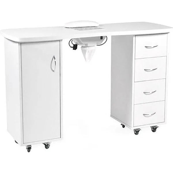 Der Nageltisch mit Absaugung Funktion - Maniküretisch Toli in Weiß bietet nicht nur ein elegantes Design, sondern auch Funktionalität. Mit einer soliden Konstruktion und einer Staubabsaugung schafft dieser Tisch komfortable Arbeitsbedingungen in Ihrem Schönheitssalon. Die Kombination aus Schubladen und einem Schrank mit Regal sorgt für ausreichend Stauraum. Die 8 Räder ermöglichen eine einfache Bewegung, wobei 2 feststellbar sind.