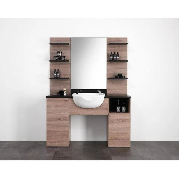 - Shampoo-Beckeneinheit: mit Keramikbecken, Mischer und Handbrause für professionelle Haarwäschen.